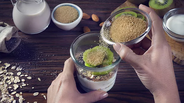 2. Agrega la leche de almendra, la avena, el Azúcar Mascabado Domino® y la chía.